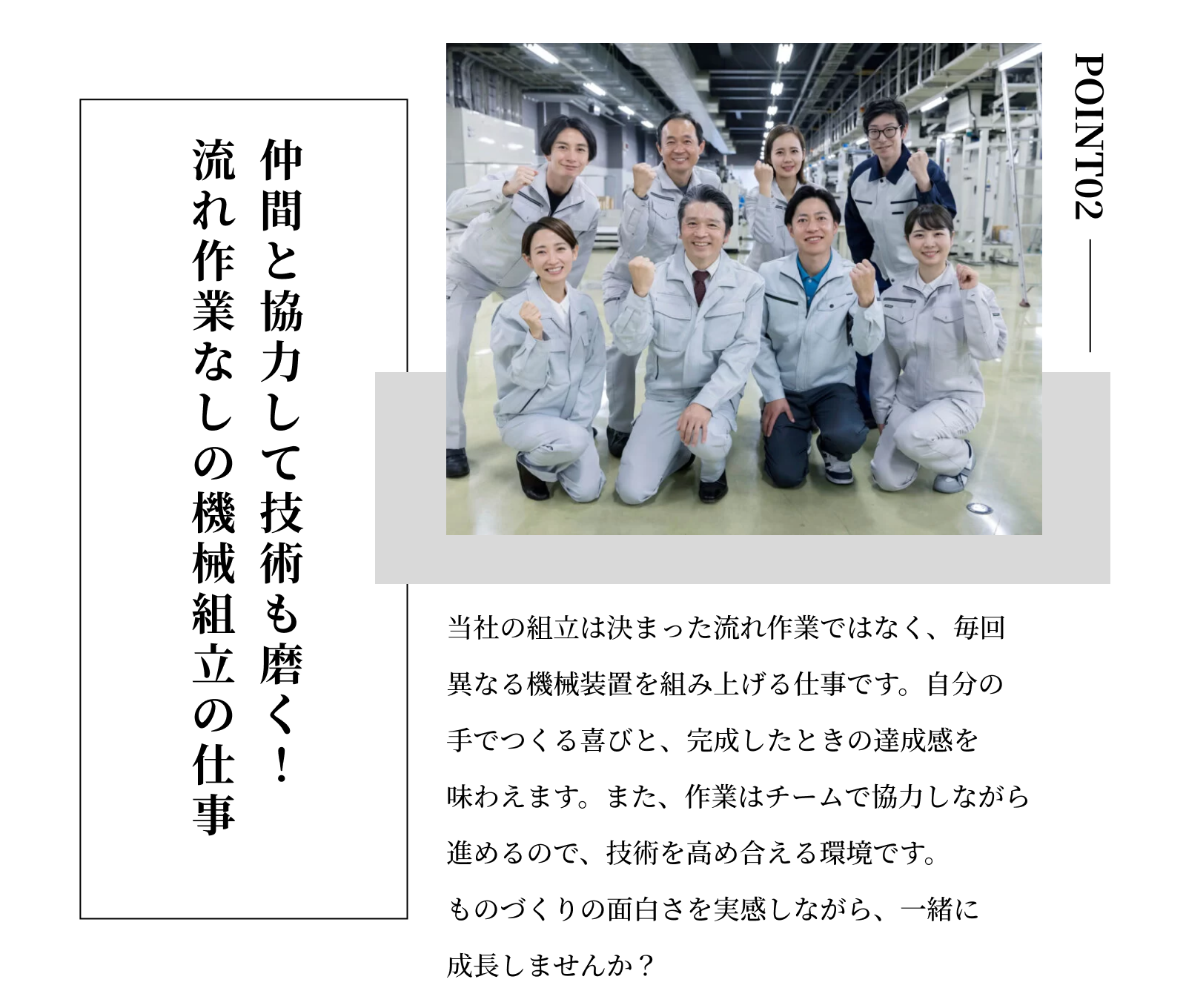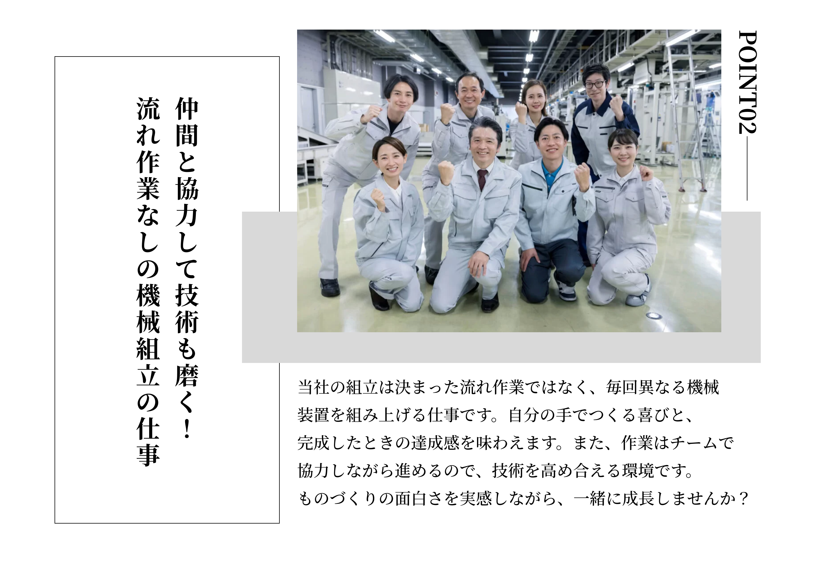 初めは組立作業からスタートし、経験を積むことで現場リーダーや現場監督、さらに管理職としてキャリアアップすることができます。また、資格を取得して専門的な技術者として活躍する道も開けます。