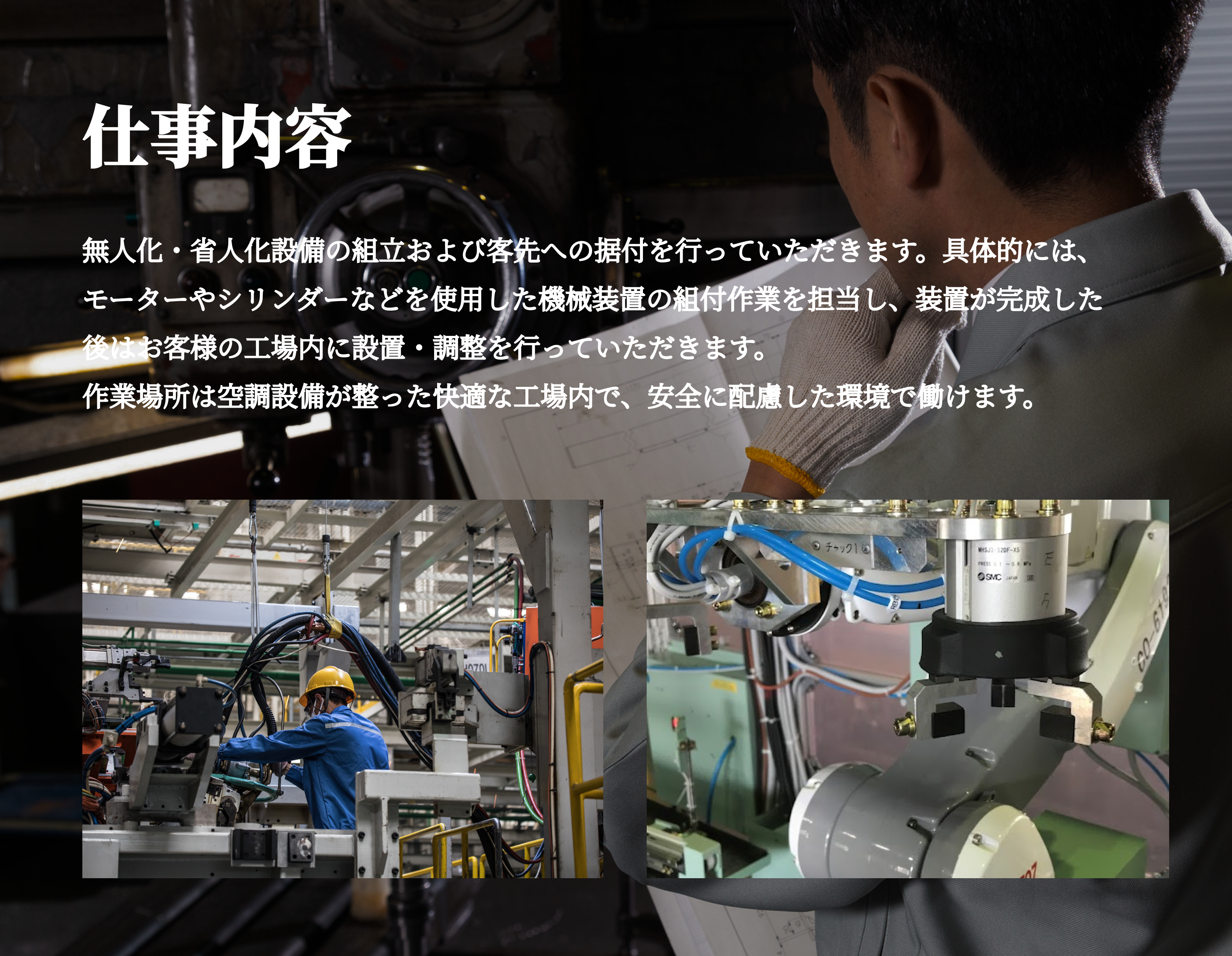 無人化・省人化に対応する設備の組立および客先据付けまで行います。 ライン作業ではなく、毎回異なる機械装置の組立を行うため、モノづくりの楽しさがあります。 モーターやシリンダーなどを使用した装置の組立作業です。 工場内は空調設備完備で快適な環境です。 |