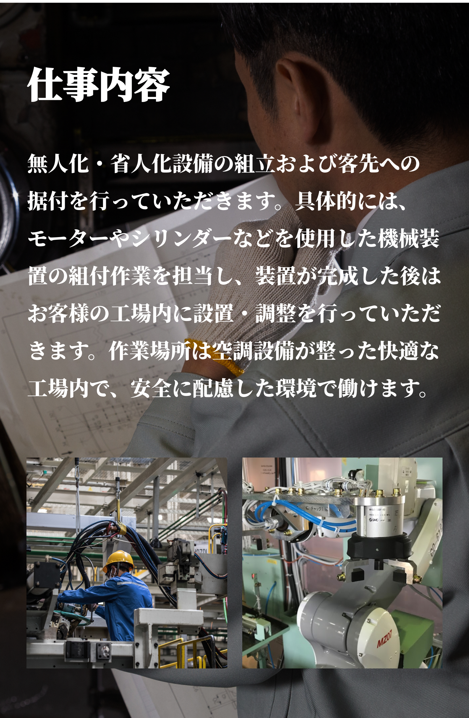 当社では主に無人化、省人化に対応する設備の組付けと、客先での据付まで行います。ライン作業のような流れ作業ではなく、毎回異なる機械装置の組立を行うため、モノづくりの楽しさがあります。具体的には、モーターやシリンダーなどを使用した装置の組立が主な業務となります。